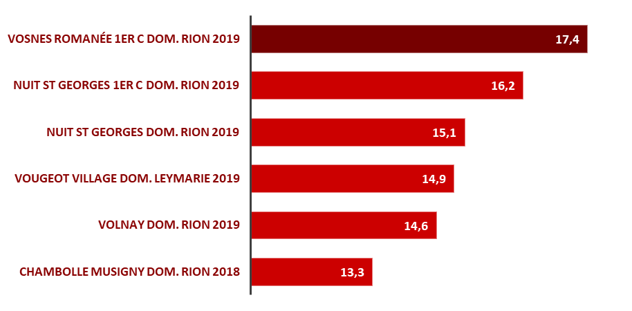 Médaille d’or ce soir pour le Vosnes Romanée avec une moyenne de 17.4 suivi du Nuit St Georges 1er c (16.2).