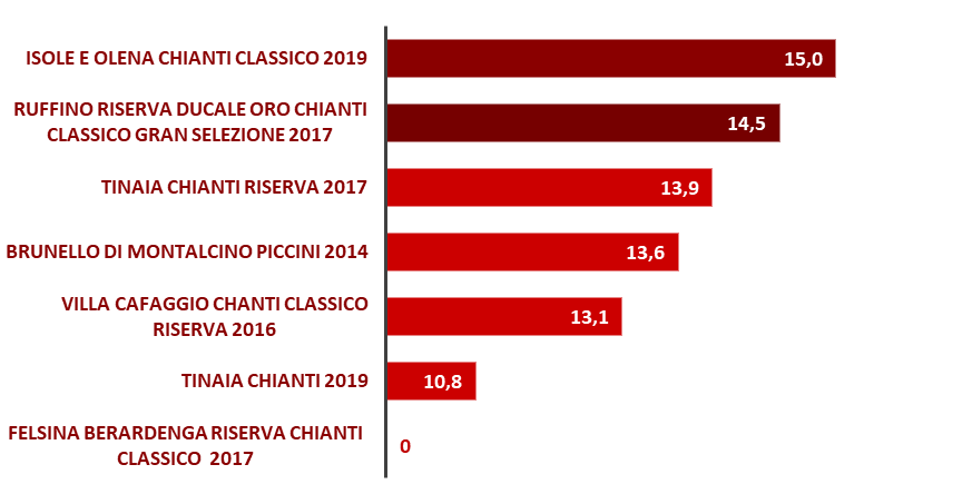 Il est temps de rentrer en France et de laisser les paysages Toscans derrière nous. La médaille d’or ce soir va à la cuvée Isole E Olena classico 2019 avec une moyenne de 15 suivis du Ruffino Riserva Ducale Oro Chianti Classico Gran Selezione 2017 (14.5).