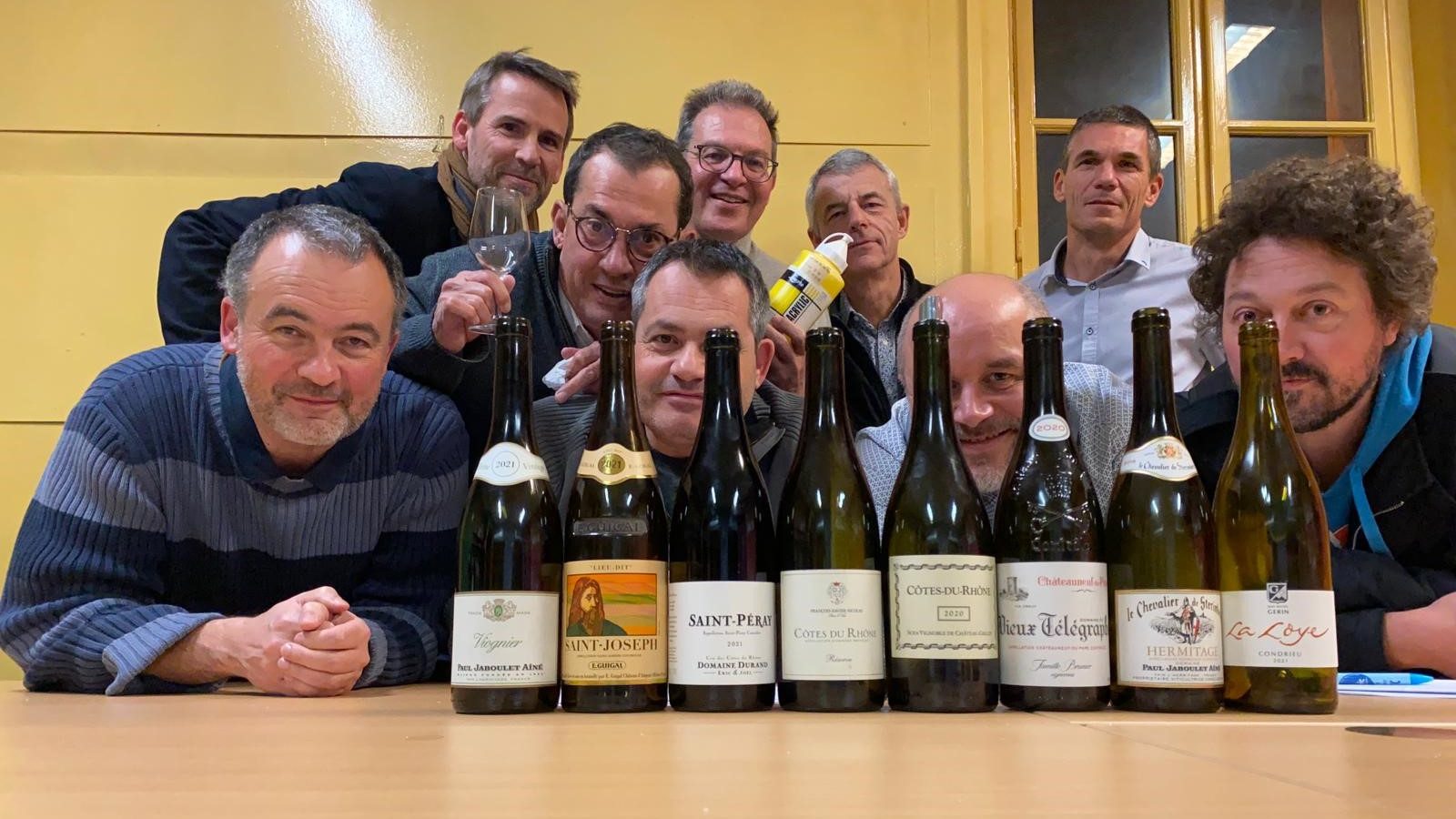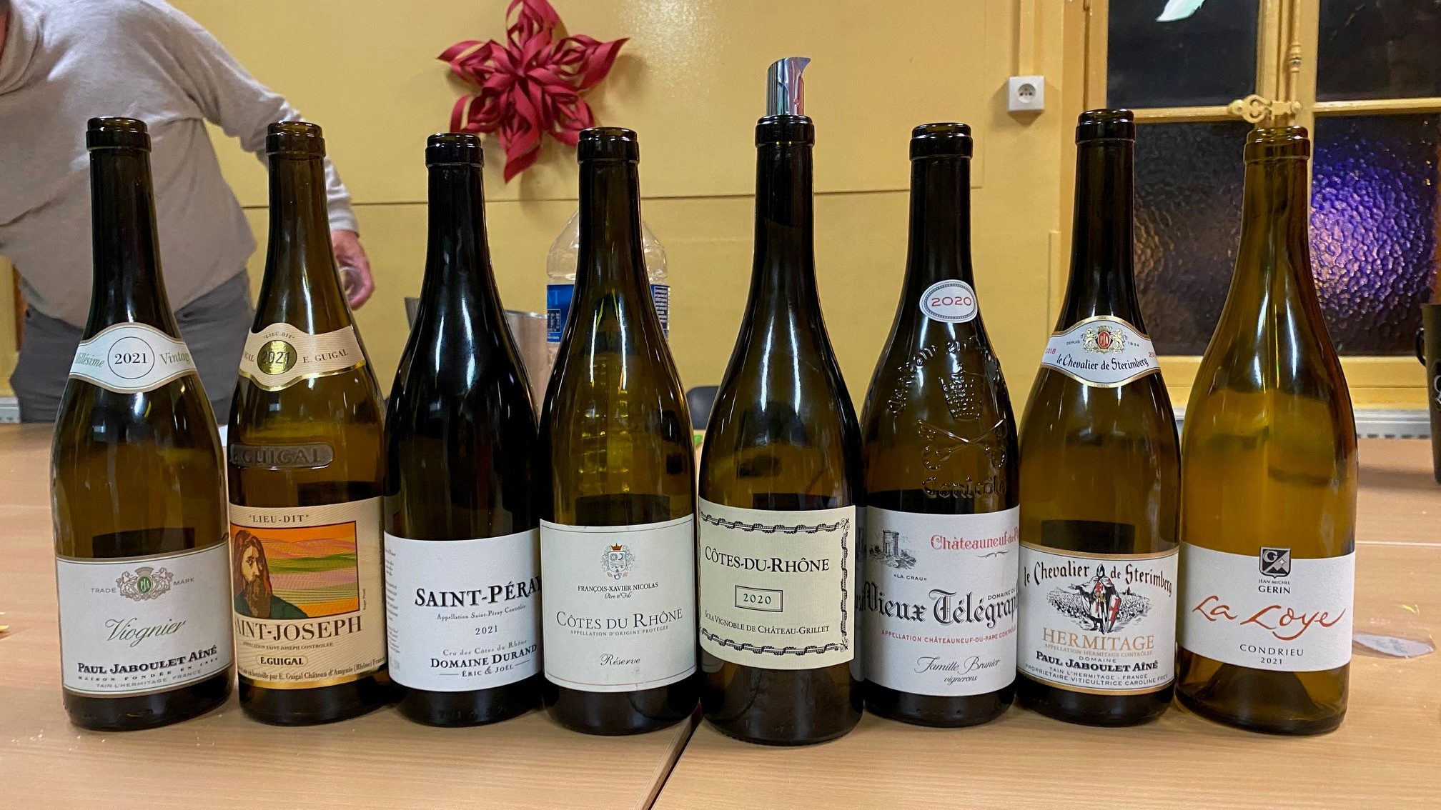 7 vins sont proposés ce soir, l’objectif est posé : identifier les arômes principaux et tenter de distinguer les grandes appellations classiques de St Péray, St Joseph, Condrieu et autres Châteauneuf…