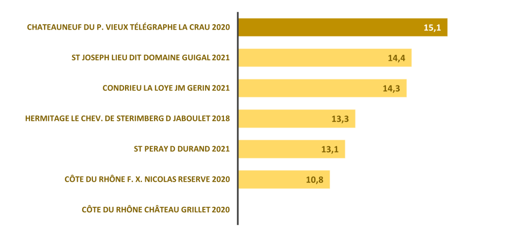 Il est temps à présent de clôturer notre séance et de décerner notre médaille d’or au domaine du vieux télégraphe avec une moyenne de dégustation de 15,1 suivis du Saint Joseph lieu-dit de Guigal (14.4) et du Condrieu La Loye de Jean Michel Gerin (14,3).