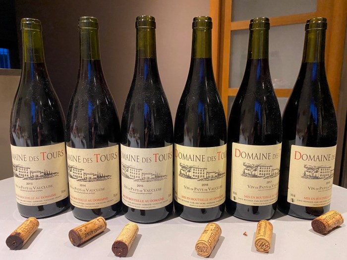 Cette séance de dégustation nous permet de nous approcher (par le biais du vin de Pays) des vins de la fameuse famille Reynaud et de son domaine Rayas (référence iconique en Châteauneuf du Pape). L’occasion nous est donnée de parcourir quelques millésimes de ce vin rouge du Vaucluse du domaine des Tours unanimement reconnu.