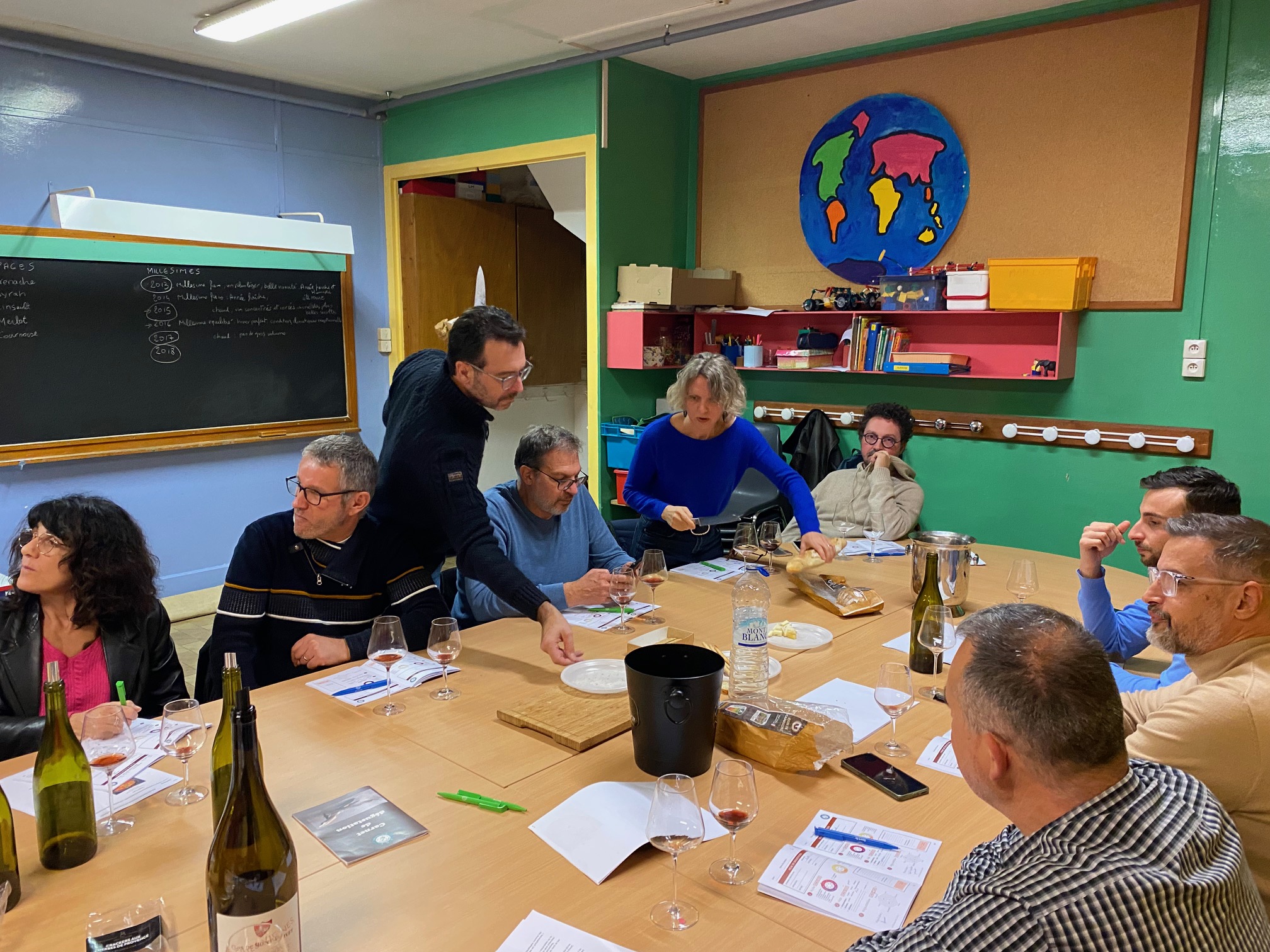 Nous avons eu à notre disposition 6 millésimes que nous avons dégustés à l’aveugle 2 à 2 pour nous familiariser avec les effets du temps et mieux les identifier sur le vin (robe, nez et arômes spécifiques en bouche). Il est effectivement à garder en tête qu’avec le temps, les arômes de fruits et d’épices évoluent vers des notes plus complexes, marquées par le cuir, la truffe, la réglisse voire l’encaustique. La robe, quant à elle, tire avec l’âge vers des teintes classiquement tuilées. Après une courte révision sur les points marquants des derniers millésimes en Rhône méridionale, nous nous lançons enfin.
