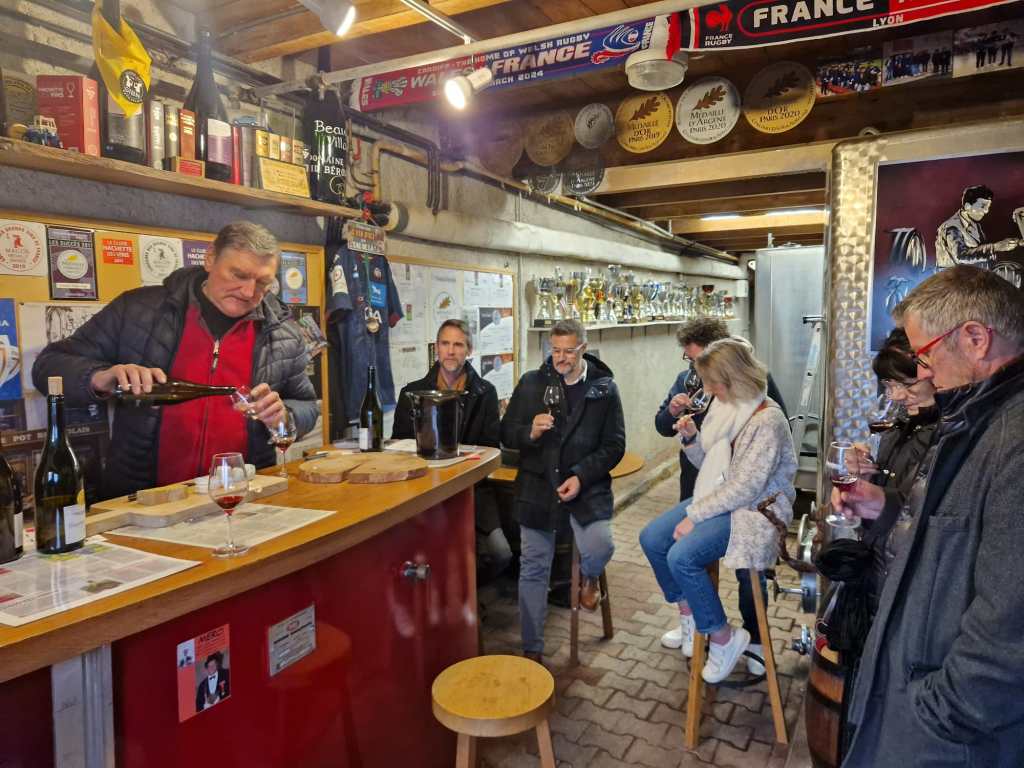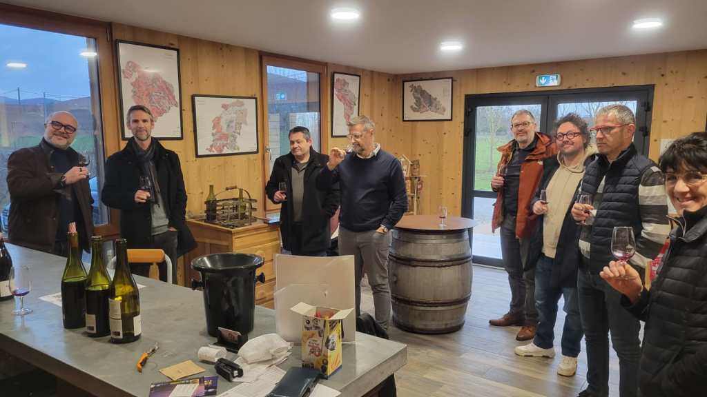 Après cette pause bien méritée, nous reprenons l’exercice en nous rapprochant de notre prochain domaine : David Béroujon. Nous sommes accueillis par l’oncle de David qui nous propose de faire le tour de la production. Nous commençons classiquement par découvrir le chardonnay puis les villages et villages fut de chêne. Une curiosité particulière de découvrir la cuvée Village qui a reçu le trophée du meilleur Gamay au concours des grands vins du Beaujolais sur le millésime 2020.